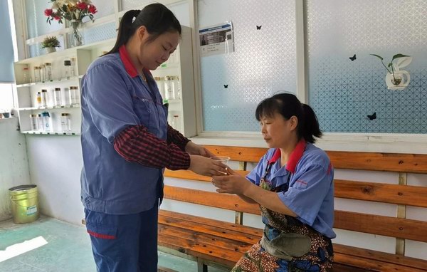 虽然现在师徒俩已经不在一起工作,但见面时,还是能够热情地聊上几句,分享工作心得,闲话家常。年近五十的佘亚芬,工作时依旧神采奕奕、充满干劲,完全不输给年轻人。那天王艳在加酸的工位上又看见了师父佘亚芬的身影,就跑过去问道:“师父,您怎么在这里?”佘亚芬笑着说:“因为这里缺人啊,我就来了。”